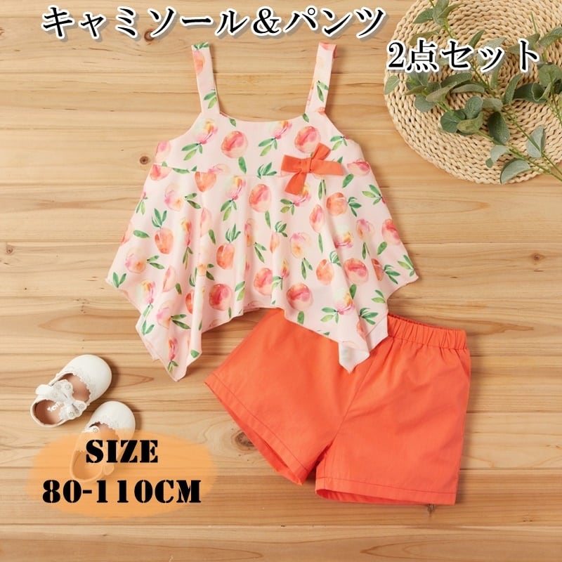 オレンジのモモ柄のトップスとパンツの2点セットです。